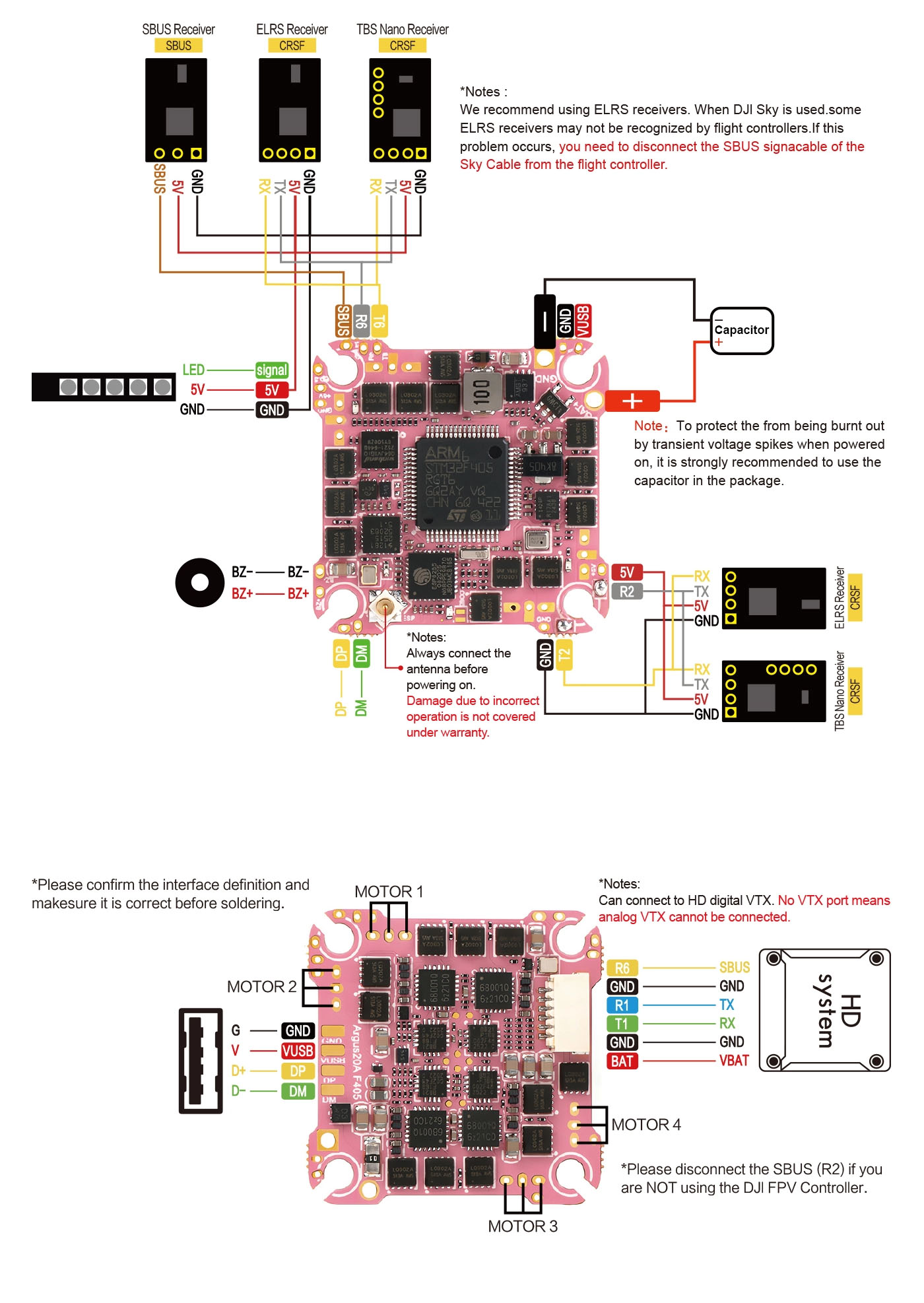 Der Kern des Flugcontrollers ist der STM32F405 Mikroprozessor und das ICM42688 Gyroskop. Die Platine verfügt außerdem über 8MB Speicher für Blackbox und ein Barometer zur Höhenmessung. Die ESCs können einen Strom von bis zu 20A verarbeiten und verwenden die Bluejay Firmware. Sie sind für Motoren der Größe 1404 und ähnlich geeignet. Der ELRS-Empfänger arbeitet bei 2.4GHz und verbindet sich über UART. Eine externe Antenne wird über einen IPEX1 Anschluss angeschlossen. Die Stromversorgung für Peripheriegeräte erfolgt über ein 5V/2A BEC. Die Platine enthält auch einen Stromsensor.