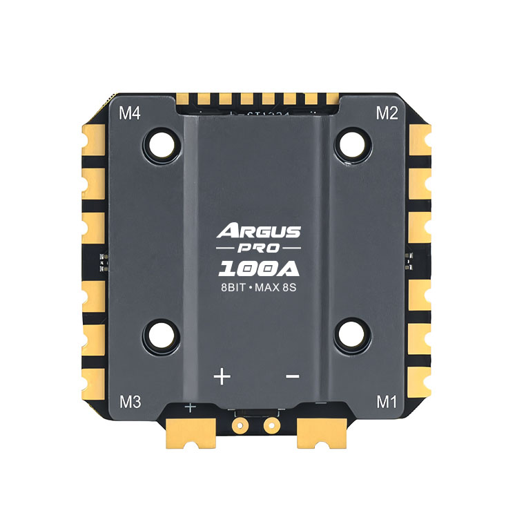 Axisflying Pro Eco 100A ist ein leistungsstarker Regler, der Ströme von bis zu 100A und bis zu 8S Batterien verarbeiten kann. Der Regler eignet sich besonders für größere 10-15" Drohnen. Er verfügt über einen Aluminium-Kühlkörper für eine bessere Wärmeabfuhr. Der Kühlkörper schützt auch empfindliche Elektronik vor Schmutz. Der Regler enthält einen Stromsensor. Ein externer elektrolytischer Kondensator muss ebenfalls an den Regler angeschlossen werden. Der Regler hat größere Abmessungen von 56x57x7mm. Stellen Sie sicher, dass im Rahmen ausreichend Platz vorhanden ist. Die Befestigungslöcher haben einen Standardabstand von 30.5x30.5mm. Der Regler verwendet Bluejay-Firmware.