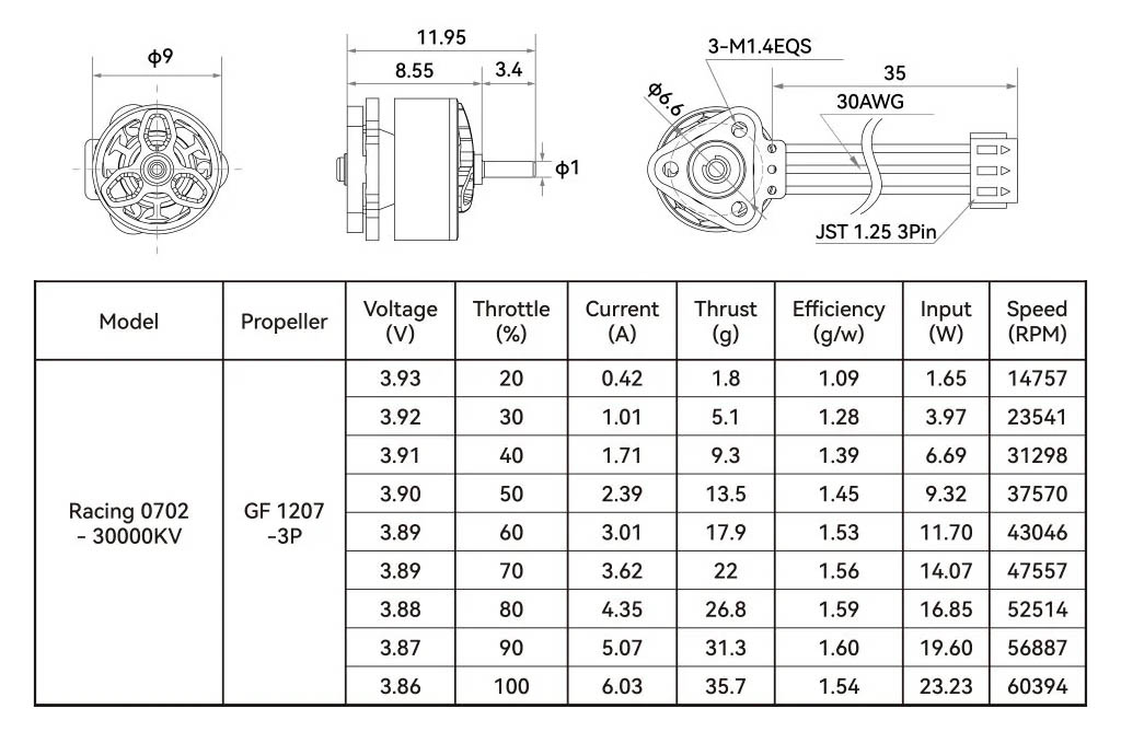 BetaFPV 0702 30000Kv sind kleine Motoren, die hauptsächlich für die kleinsten 1S 65mm Tinywhoops, wie den BetaFPV Air65 II, geeignet sind. Die Racing-Version hat einen hohen Kv und standardmäßige rutschende Messingbuchsen. Sie sind geeignet für schnelle Racing Tinywhoops und erfahrene Piloten. Die Motoren verwenden dünne 0.1 mm Bleche, um magnetische Verluste zu reduzieren und die Effizienz zu verbessern. Die Motoren haben einen Wellen Durchmesser von 1 mm und M1.4 Montagelöcher mit einem Durchmesser von 6.6 mm. Sie sind mit einem 30AWG Kabel ausgestattet, das 35 mm misst, und enden mit einem JST1.25 Stecker für einen direkten Anschluss an das AIO Board.