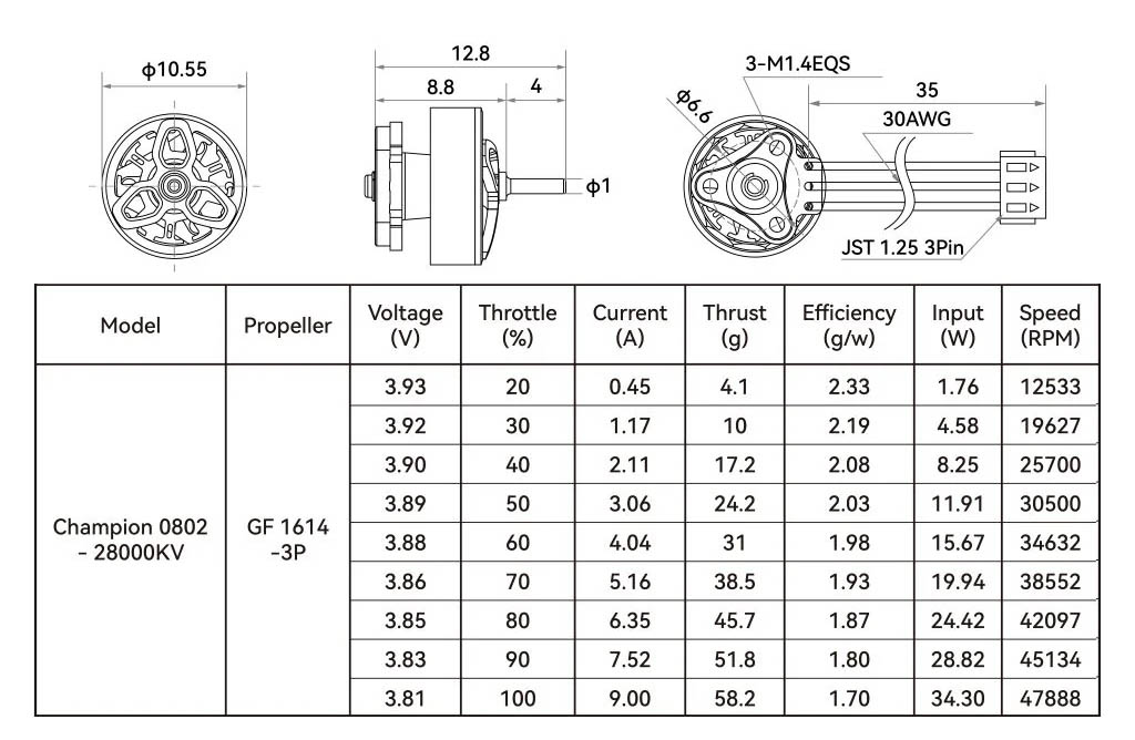 BetaFPV 0802 28000Kv sind kleine Motoren, die hauptsächlich für die kleinsten 1S 65 und 75mm Tinywhoops wie den BetaFPV Air75 II geeignet sind. Die Champion-Version hat nicht nur einen sehr hohen Kv, sondern auch Kugellager. Sie sind daher für die leichtesten und schnellsten Tinywhoops sowie erfahrene Piloten geeignet. Die Motoren verwenden dünne 0,1 mm Laminationen, wodurch magnetische Verluste reduziert und die Effizienz verbessert wird. Die Motoren haben einen Wellen-Durchmesser von 1 mm und M1.4 Montagenlöcher mit einem Durchmesser von 6,6 mm. Sie sind mit einem 30AWG Kabel von 35 mm Länge ausgestattet, das mit einem JST1.25 Stecker endet, um eine direkte Verbindung zur AIO-Platine herzustellen.