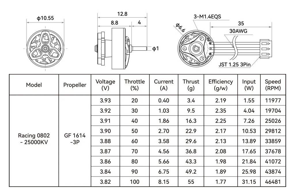 BetaFPV 0802 25000Kv sind kleine Motoren, die hauptsächlich für die kleinsten 1S 65 und 75mm Tinywhoops geeignet sind, wie z. B. die BetaFPV Air75 II. Die Motoren der Racing-Version haben einen höheren Kv und standardmäßige gleitende Messingbuchsen. Sie sind daher für schnelle Racing-Tinywhoops und erfahrene Piloten geeignet. Die Motoren verwenden dünne 0.1 mm Laminierungen, die magnetische Verluste reduzieren und die Effizienz verbessern. Die Motoren haben einen Wellen-Durchmesser von 1 mm und M1.4 Montagemöglichkeiten mit einem Durchmesser von 6.6 mm. Sie sind mit einem 30AWG Kabel ausgestattet, das 35 mm lang ist und mit einem JST1.25 Stecker für den direkten Anschluss an die AIO-Platine enden.