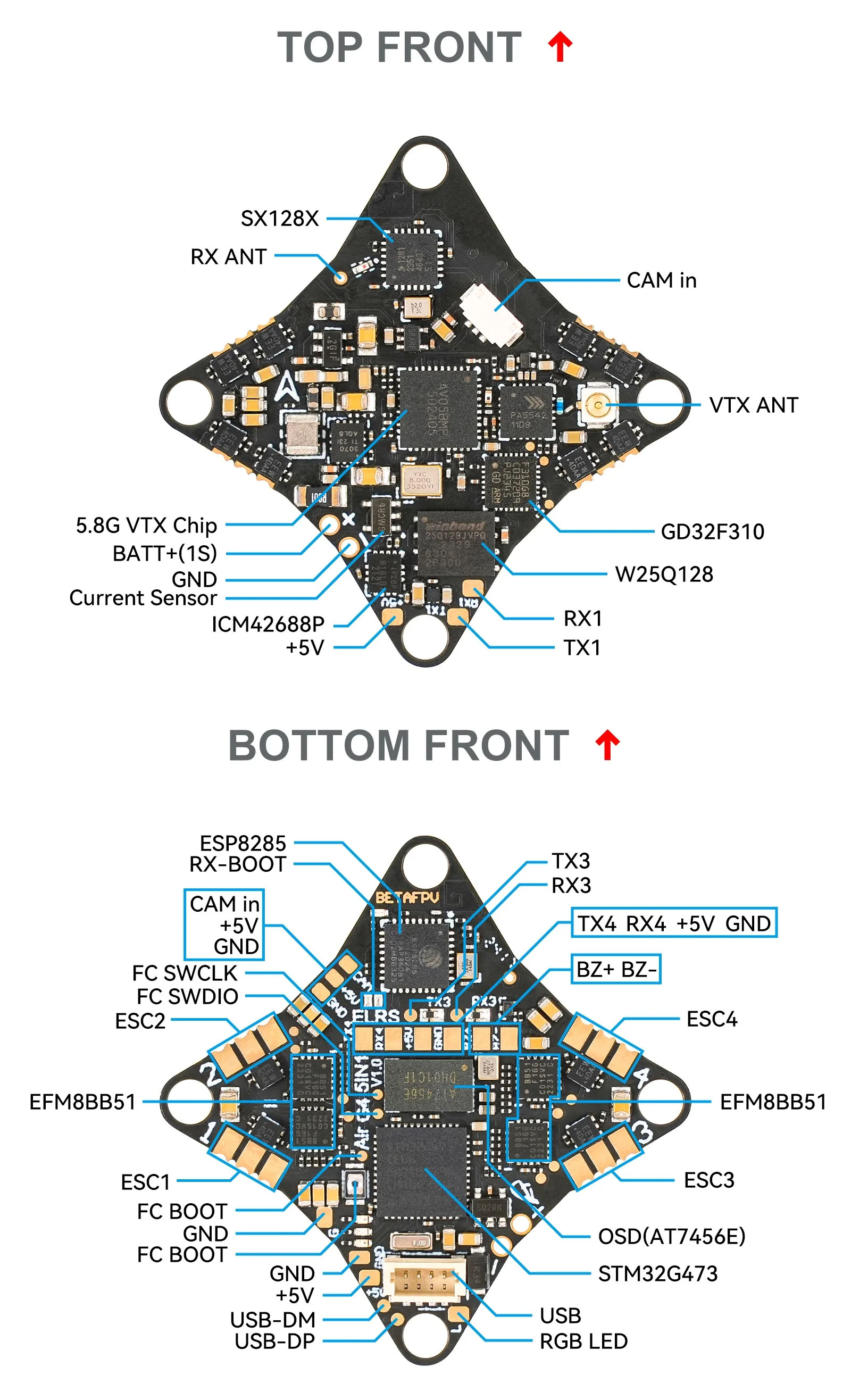 The flight controller is equipped with an STM32G473 processor and an ICM42688P gyro. It also features 16MB blackbox memory. The integrated 4-in-1 ESCs support up to 5A and run Bluejay firmware. Motors must be soldered directly to the board. Use extra caution when soldering, as excessive heat may cause components on the opposite side to detach.