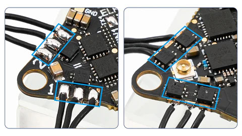 The built-in 5.8GHz VTX supports output power of 25/100/200/400 mW. With SmartAudio support, VTX settings can be easily adjusted through Betaflight. For indoor flying, 25–100 mW is recommended to reduce heat and battery drain. The antenna connects via u.FL connector. The RC link is handled by an integrated 2.4GHz ELRS receiver connected via UART. The UART pads remain available, allowing the onboard receiver to be disabled and replaced with an external one if required. The internal ELRS receiver uses a direct-soldered wire antenna.