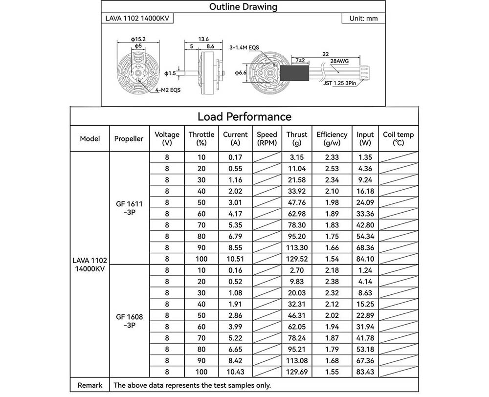 BETAFPV LAVA 1102 14000KV ist ein kleiner Motor, der für 1,6" Tinywhoop-Drohnen mit 2S-Akkus entwickelt wurde. Die Motoren verfügen über kurze 28AWG-Kabel mit einer Länge von 22 mm und einen Steckanschluss für den einfachen Anschluss an ein AIO-Flight-Controller-Board. Die Wellenstärke beträgt 1,5 mm, und die Montagelöcher entsprechen dem 6,6 mm M1.4 Standard.