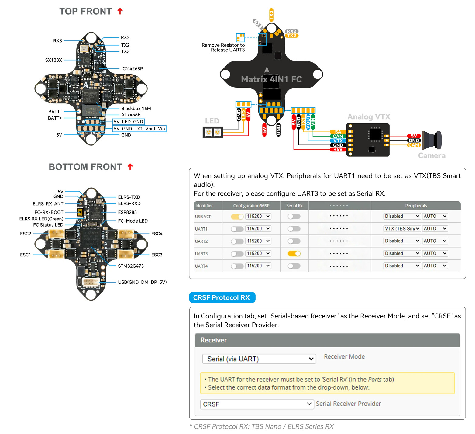 RC-Übertragung wird durch den integrierten ELRS 2.4 GHz Empfänger bereitgestellt, der über UART verbunden ist. Die UART-Verbindung ist auf dem Board verfügbar, und wenn nötig, kann der integrierte Empfänger getrennt und ein externer angeschlossen werden. Der interne ELRS-Empfänger verwendet eine drahte Antenne, die direkt auf dem Board mit Strom versorgt wird.