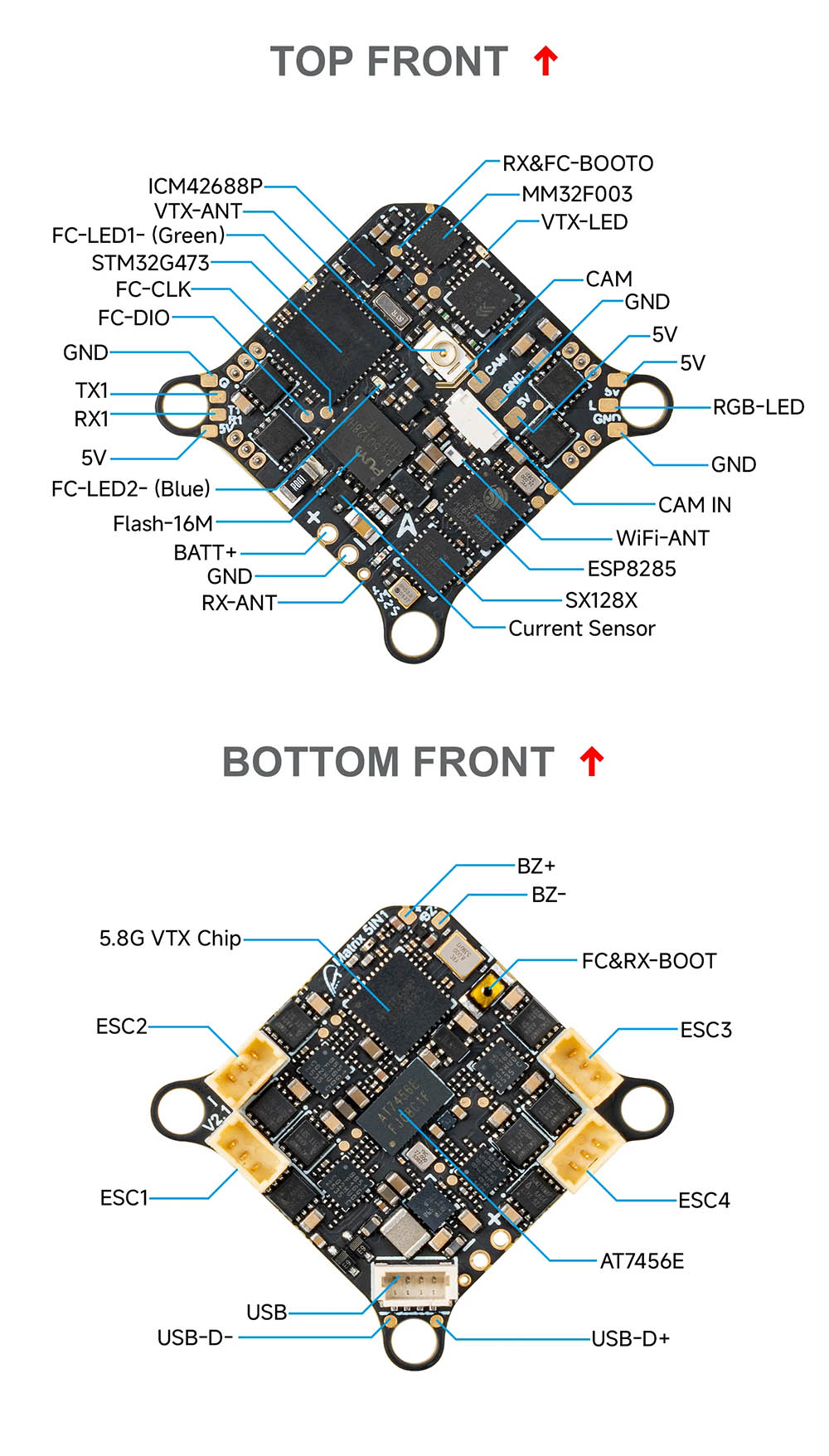 Der Flugcontroller ist mit einem STM32G473-Prozessor und einem ICM42688P-Gyroskop ausgestattet. Es gibt auch 16 MB Speicher für Blackbox. Die integrierten 4in1 ESCs können im zweiten Version bis zu 12 A Strom verarbeiten und verwenden die Bluejay-Firmware.