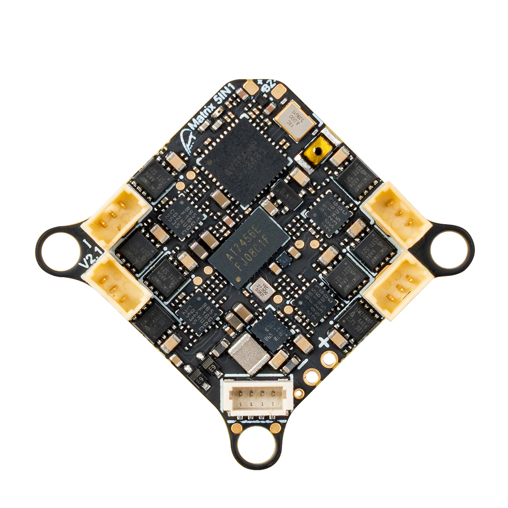 BetaFPV Matrix G4 5in1 ist eine AIO-Platine, die für 1S TinyWhoops und andere kleine FPV-Drohnen konzipiert wurde. Die Platine umfasst einen Flugcontroller, ESCs, RC-Empfänger, einen analogen Videotransmitter und einen OSD-Chip. Sie ist auf einer 1 mm dicken PCB montiert, um eine gute Haltbarkeit zu gewährleisten. Die Platine ist in zwei Versionen erhältlich - mit Steckern für eine einfache Motorverbindung oder ohne Stecker zum Löten der Motoren. Die Platine ist nur an 3 Punkten gesichert. Die Vorderseite hält nicht am Rahmen, wodurch die Wahrscheinlichkeit einer Beschädigung des Flugcontrollers bei Verformungen des Kunststoffrahmens verringert wird.
