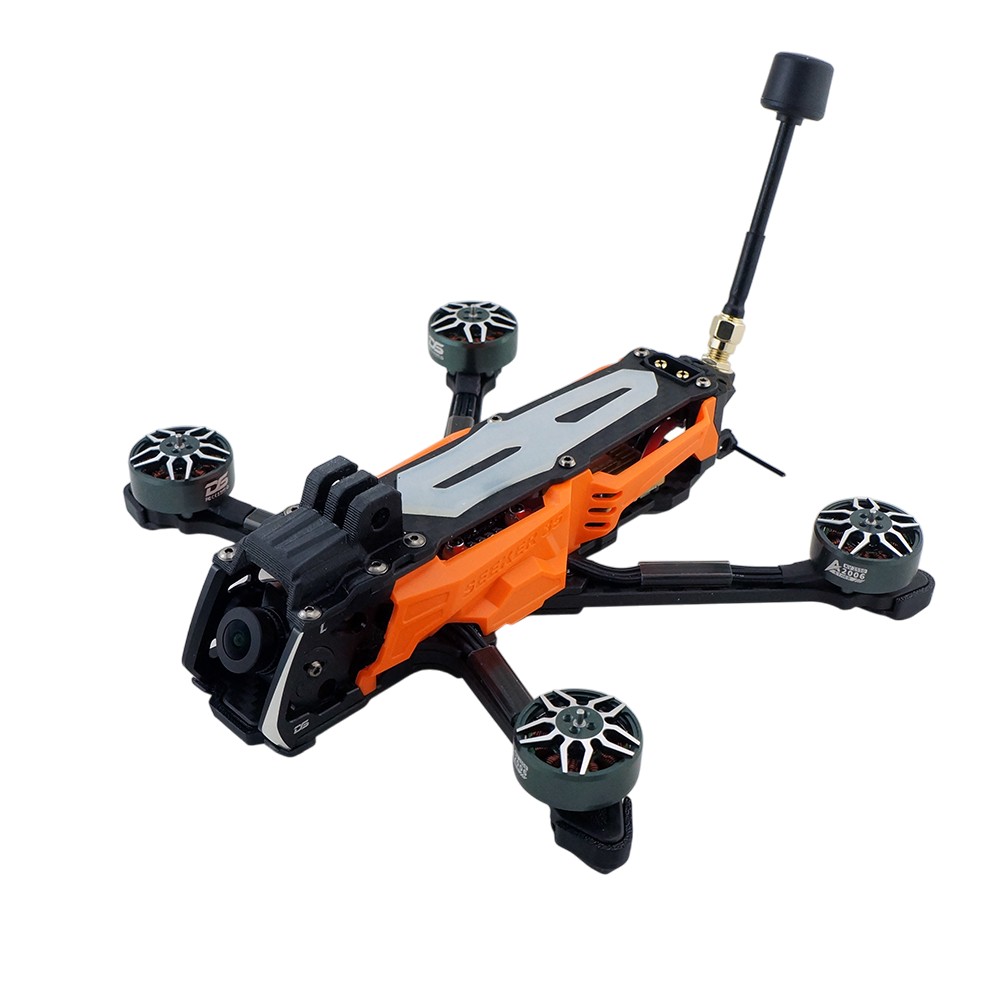 Seeker 3.5 ist eine leistungsstarke kleinere Freestyle Drohne für 3.5" Propeller. Seeker ist mit analoger Videoübertragung mit einer Leistung von bis zu 1300mW ausgestattet. Sie eignet sich für Flüge im Freien auf Feldern oder größeren Gärten. Der Rahmen hat die Form eines Deadcat, wobei die Kamera vor den Armen platziert ist, sodass die Propellerkanten nicht im Kamerabild sichtbar sind. Die Drohne verfügt über eine Halterung für eine externe Actionkamera und ein GPS-Modul, das eine automatische Rückkehr zum Startpunkt ermöglicht. Das Bild zeigt auch Informationen über Geschwindigkeit, Höhe und Entfernung. Die FPV-Kamera ist in Aluminium-Seitenplatten gesichert, die die Kamera schützen. Empfindliche Elektronik ist mit Kunststoffseitenplatten abgedeckt. Im Paket sind orange Seitenplatten und ein paar schwarze Seitenplatten enthalten. Hinten befindet sich ein sicher montierter XT60-Anschluss, der die Möglichkeit eliminiert, dass die Propeller die Batteriekabel durchtrennen. Der ELRS-Empfänger, der auf 2.4 GHz arbeitet, ist außen am Rahmen in einem Kunststoffgehäuse montiert. Dadurch ist er leicht zugänglich und trotzdem geschützt. Unten befindet sich ein Buzzer, um die Drohne im hohen Gras leicht zu finden. Neben der Kamera gibt es einen externen USB-C-Anschluss für die einfache Einrichtung des Flugcontrollers. Für hohe Haltbarkeit sind die Arme aus 4mm dickem Karbon gefräst.