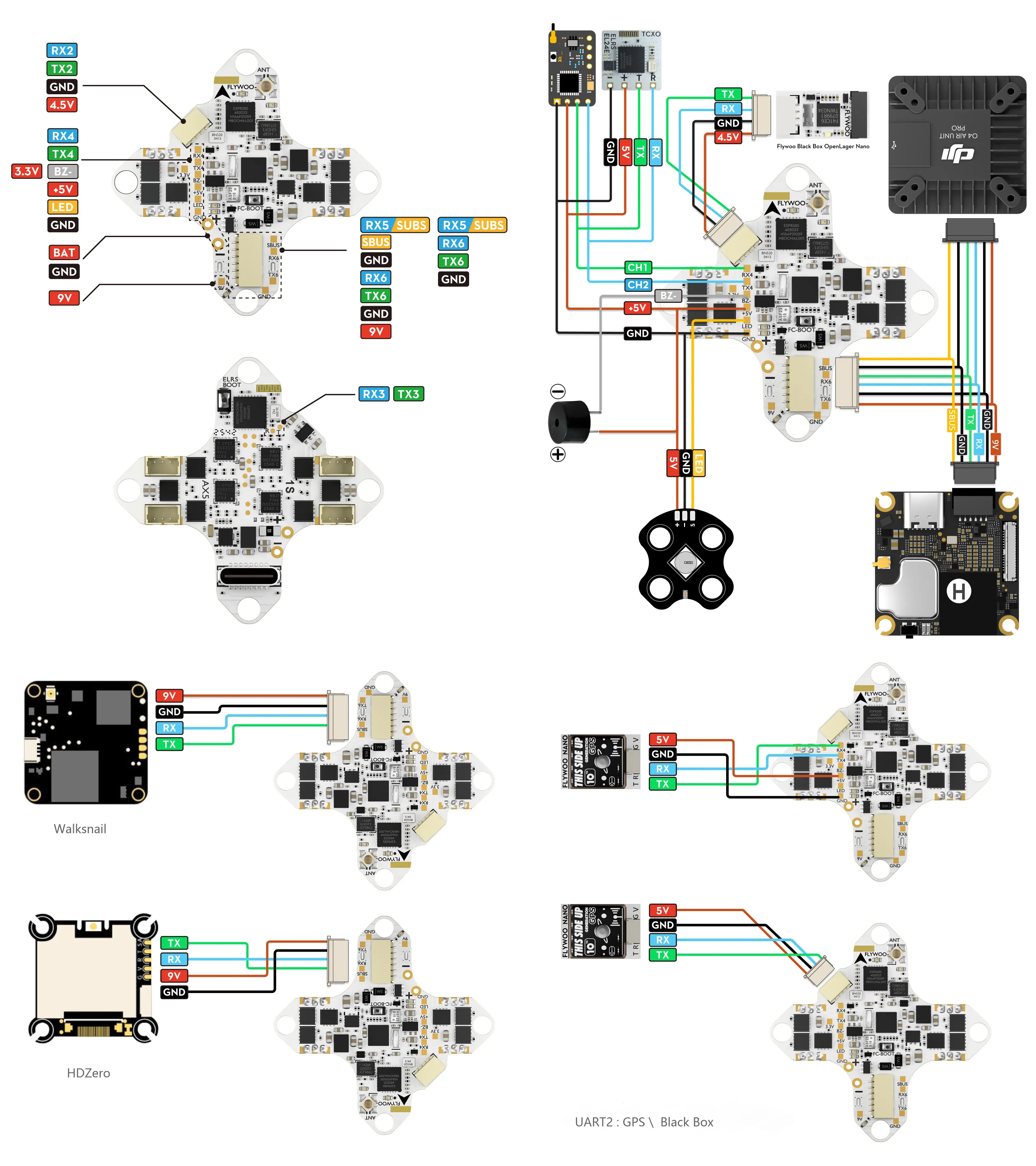 Flywoo GOKU F405 AIO ist eine Platine, die Flugcontroller, Regler und ELRS-Empfänger kombiniert. Die Platine ist für Tinywhoops und kleine Toothpicks konzipiert, die mit 1S LiPo-Batterien betrieben werden und mit digitaler Videoübertragung ausgestattet sind. Sie verfügt über einen integrierten Step-up BEC für 5V und 9V für die nahtlose Stromversorgung von DJI O4, O4 Pro, Walksnail und HDZero Videoübertragern, die über einen standardmäßigen Anschluss verbunden werden. Die Einheit ist nicht mit einem OSD-Chip für analoges Video ausgestattet.