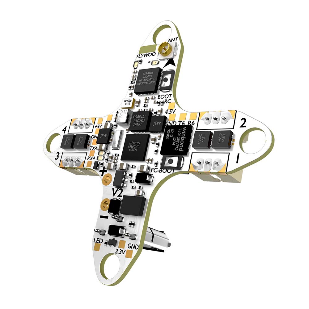 Der Flugcontroller verwendet einen STM32F405-Mikroprozessor in Kombination mit einem Gyroskop ICM42688P. Er verfügt auch über 8MB Speicher für Blackbox und ein Barometer zur Höhenmessung. Die ESCs verwenden Bluejay-Firmware, verarbeiten 5A Strom und sind für Motoren 0702–0803 geeignet. Anschlüsse sind vorhanden, um eine einfache Motorverbindung zu ermöglichen.