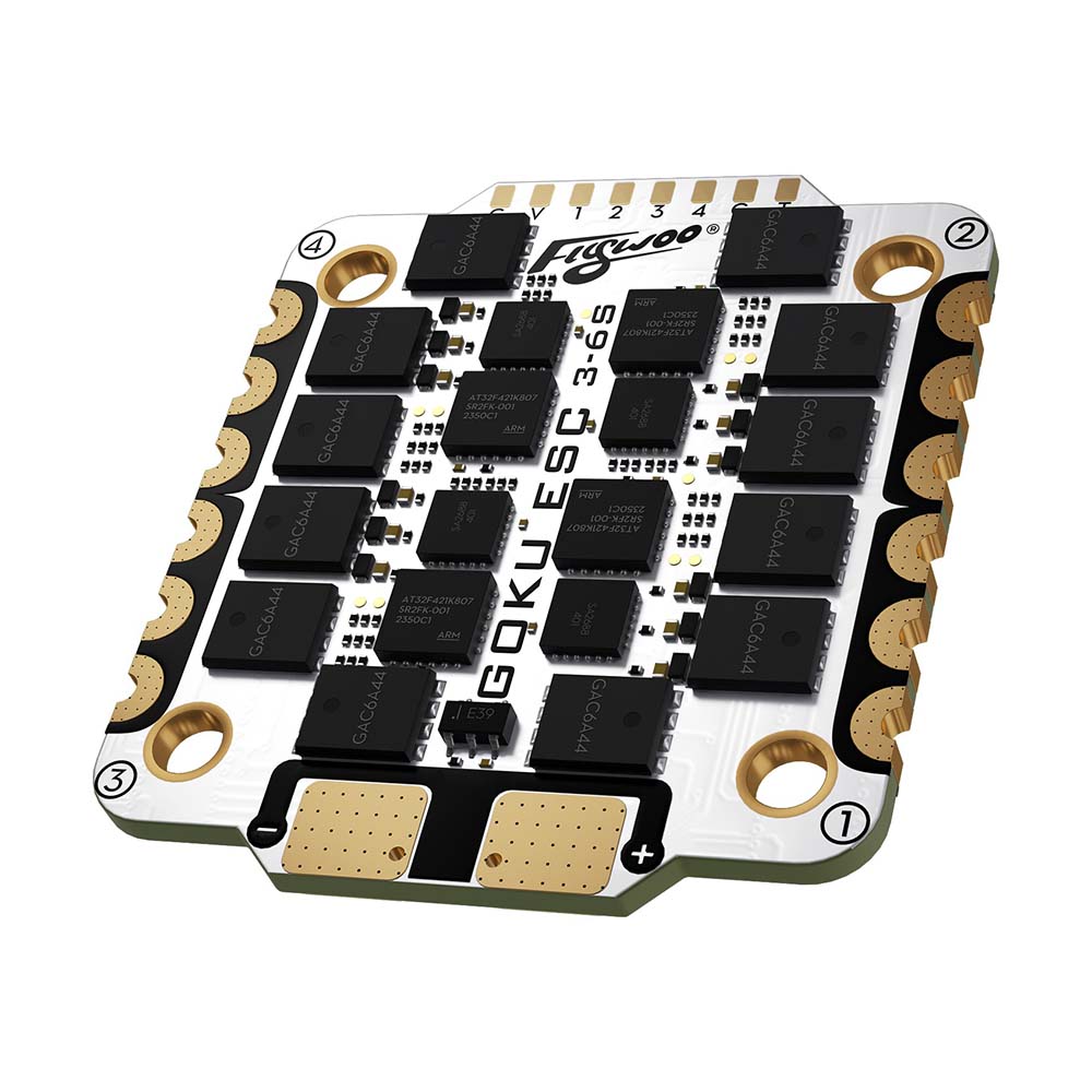 Flywoo GOKU G55M AM32 ist ein 32-Bit-Regler, der für Freestyle- und Renndrohnen entwickelt wurde, die von 3–6S LiPo-Batterien betrieben werden. Die Regler können einen Strom von bis zu 55 A pro Kanal verarbeiten. Der Regler verwendet moderne Firmware AM32, die bidirektionales DShot, Telemetrie und eine AusgangsPWM-Frequenz von bis zu 96 kHz unterstützt.