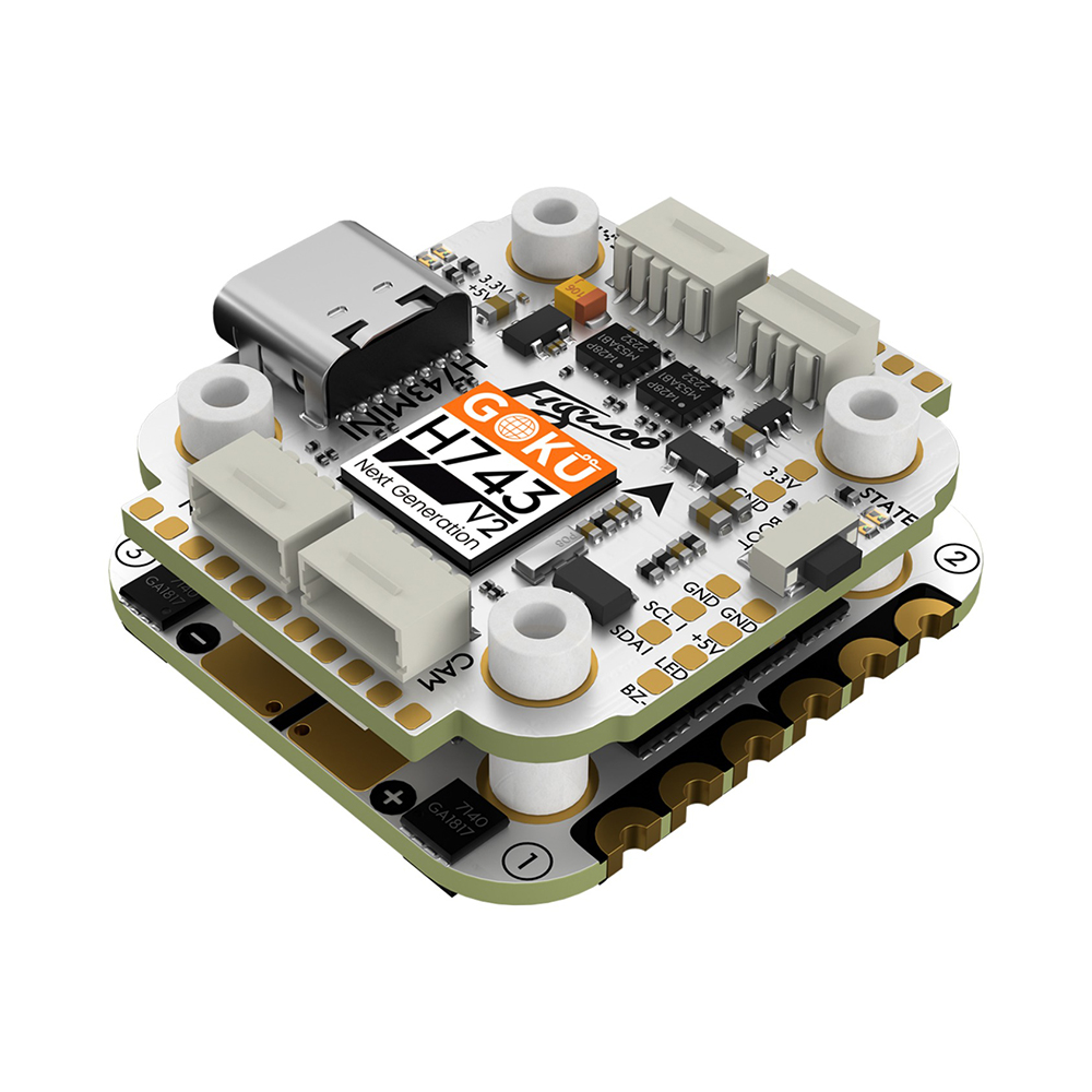 Der Flugcontroller verwendet einen leistungsstarken H743 Prozessor und verfügt über ein Paar unabhängiger ICM42688P Gyroskope für bessere Zuverlässigkeit. Der Flugcontroller unterstützt die Firmware Betaflight, iNav und ArduPilot. Er hat 12 PWM-Ausgänge für Motoren und Servos, 5V/2A BEC und ein umschaltbares 10V/2A BEC, um den Video-Transmitter zu speisen. Der Flugcontroller hat zwei Kameraeingänge, die während des Flugs umgeschaltet werden können. Er enthält auch einen großen 512 MB Speicher für Blackbox und ein Barometer zur Höhenmessung. Für die Verbindung mit Peripheriegeräten hat er acht UARTs und einen I2C-Bus. Die Platine ist mit Steckverbindern ausgestattet, um eine einfache Verbindung anderer Komponenten ohne Löten zu ermöglichen. Lötpads sind auf der Unterseite der Platine verfügbar.
