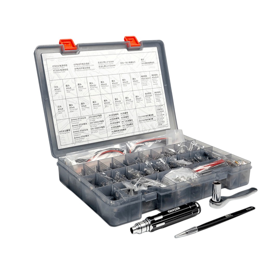 Der Kunststoff-Organizer, der 25,5x19x4cm misst und 1021g wiegt, enthält eine große Auswahl an Schrauben M2 und M3 in Längen von 6mm bis 27mm, Stahl- und selbstsichere Muttern sowie Aluminium-Abstandshalter. Das Paket enthält auch Softmounts für Flugsteuerungen, XT30 und XT60 Anschlüsse, Kondensatoren und Verkabelungen für digitale Systeme oder SH1.0 Anschlüsse. Für die sofortige Wartung umfasst das Set Werkzeuge in Form eines 8mm Ratschenschlüssels für Motormuttern, eines 4-in-1 Innensechskantschlüssels und einer Pinzette.