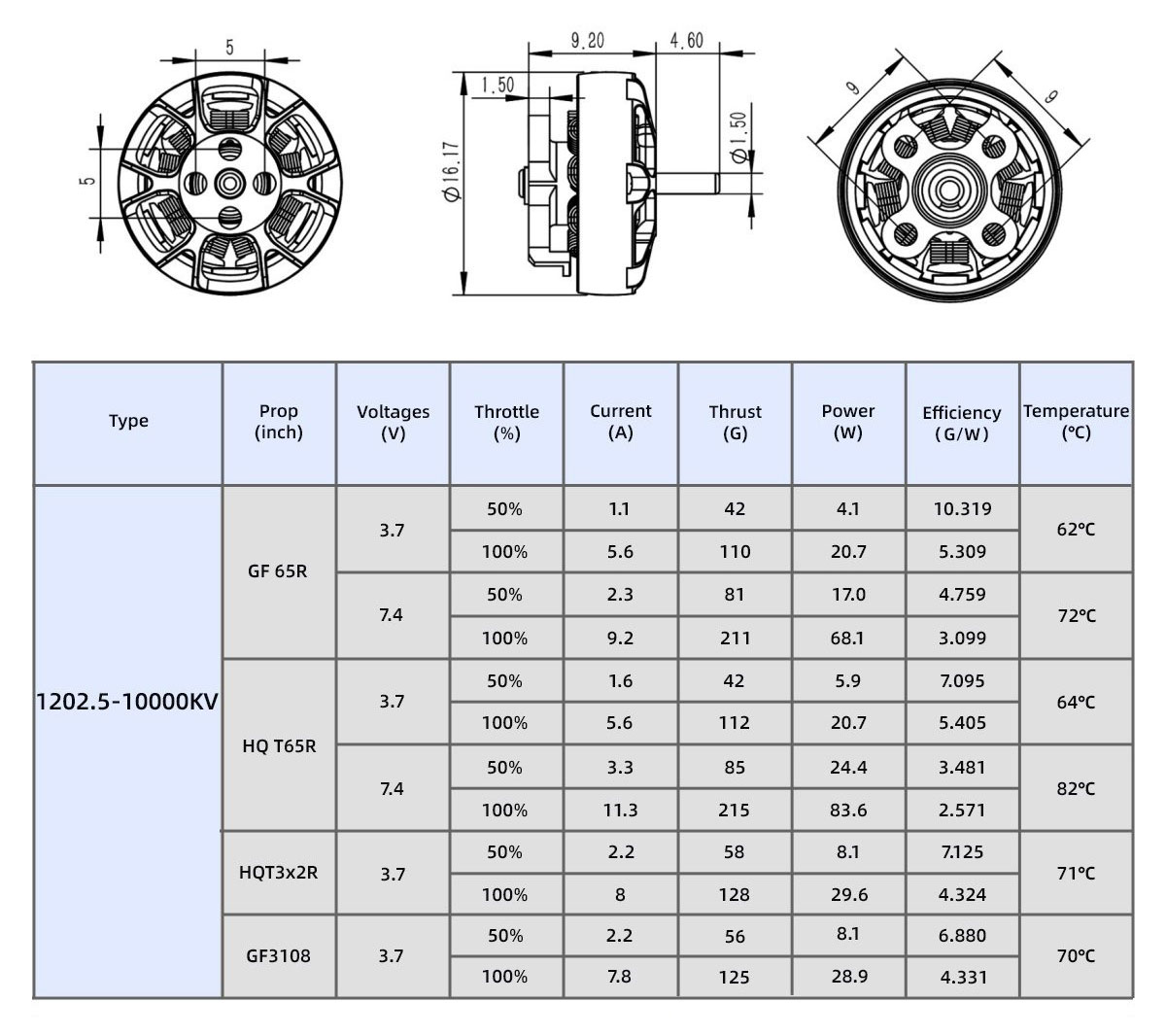 Der Motor hat einen 12 mm Durchmesser Stator und eine Höhe von 2.5 mm, ausgestattet mit 415ZZ Lagern und einem Wellen Durchmesser von 1.5 mm. Die Montageschrauben sind 9 mm M2. Die Motoren kommen mit 28AWG Kabeln, die 60 mm lang sind. Der Motor hat eine Oberfläche in titangold Farbe.
