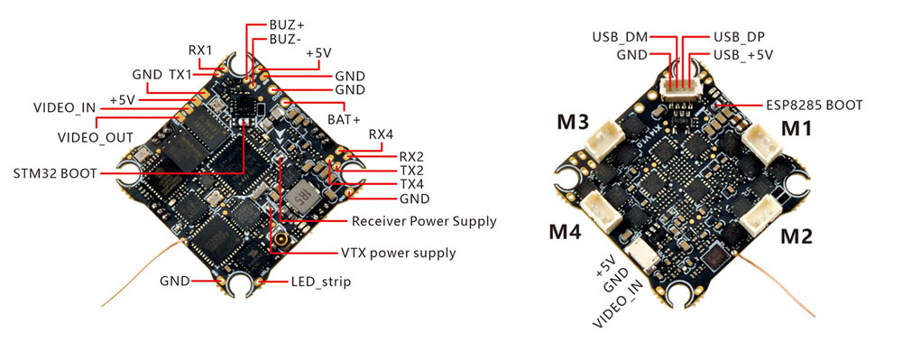 Der Kern des Flugcontrollers ist der G473 Prozessor, ergänzt durch das ICM42688P Gyroskop. Trotz ihrer Größe enthält die Platine nicht nur einen Spannungssensor, sondern auch einen Stromsensor. Die Platine ist auch mit 16MB Speicher für Blackbox und einem 5V/2A BEC ausgestattet. Die ESCs mit Bluejay Firmware unterstützen eine Leistung von 1–2S Batterien und Ströme von bis zu 12 A. Sie eignen sich für Motoren der Größe 0802–1104 und für weniger aggressive Copter sogar 1404.