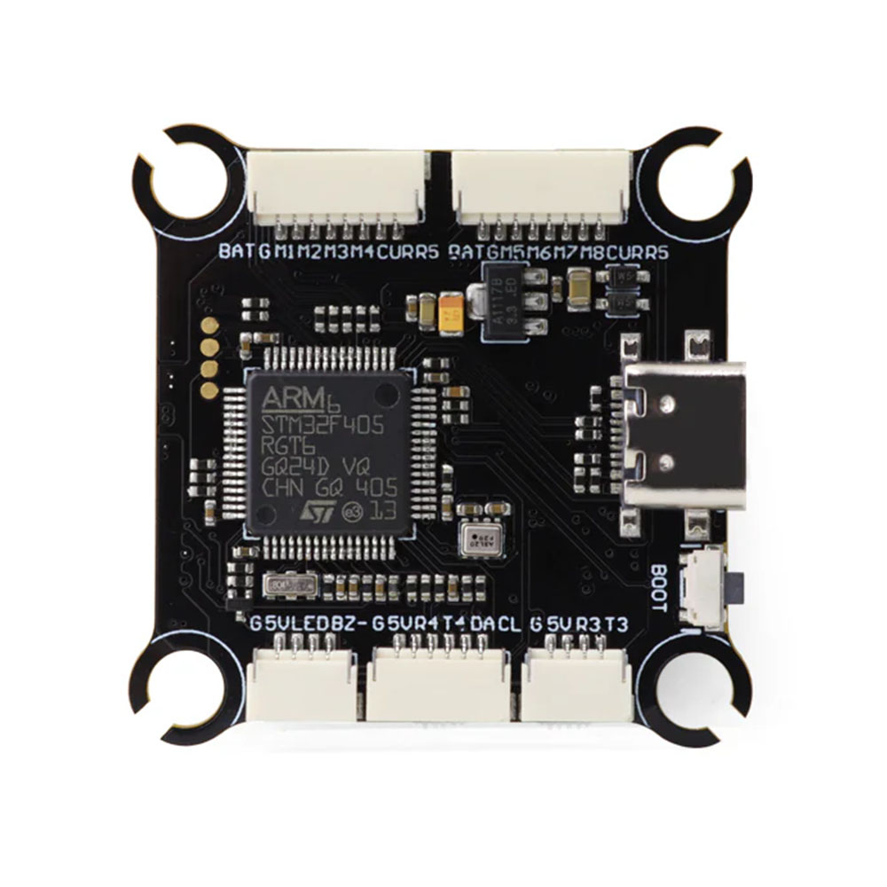 Der Kern des Flugcontrollers ist der F405 Mikroprozessor, ergänzt durch das ICM42688P Gyroskop. Die Platine enthält außerdem ein Barometer zur Höhenmessung und 16MB Speicher für die Blackbox. Ein Vorteil ist die Möglichkeit, bis zu 8 Motoren und zwei Kameras anzuschließen, zwischen denen umgeschaltet werden kann. Die Platine ist mit Steckverbindern ausgestattet, die eine einfache Verdrahtung ohne Löten ermöglichen.