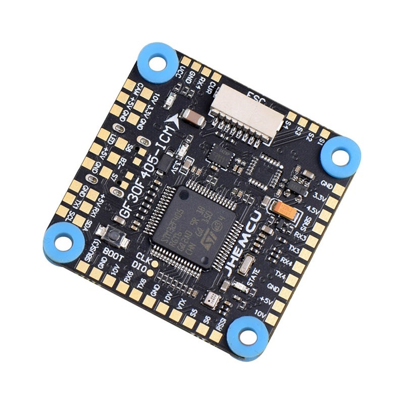 Jhemcu GF30F405 ist ein erschwinglicher Flugcontroller mit einem Lochabstand von 30.5x30.5mm. Das Board ist hauptsächlich für Freestyle- und Langstrecken 3-8S Lipo betriebene Drohnen geeignet. Der Kern ist der F405 Prozessor in Kombination mit dem ICM-42688-P Gyroskop. Das Board verfügt auch über einen integrierten SPL06 Barometer zur Höhenmessung und 16MB Speicher für Blackbox. Das Board ist mit einem Chip für analoges OSD ausgestattet. Es hat 4 UARTs, I2C-Pads, 5V/3A BEC und 10V/2A BEC.