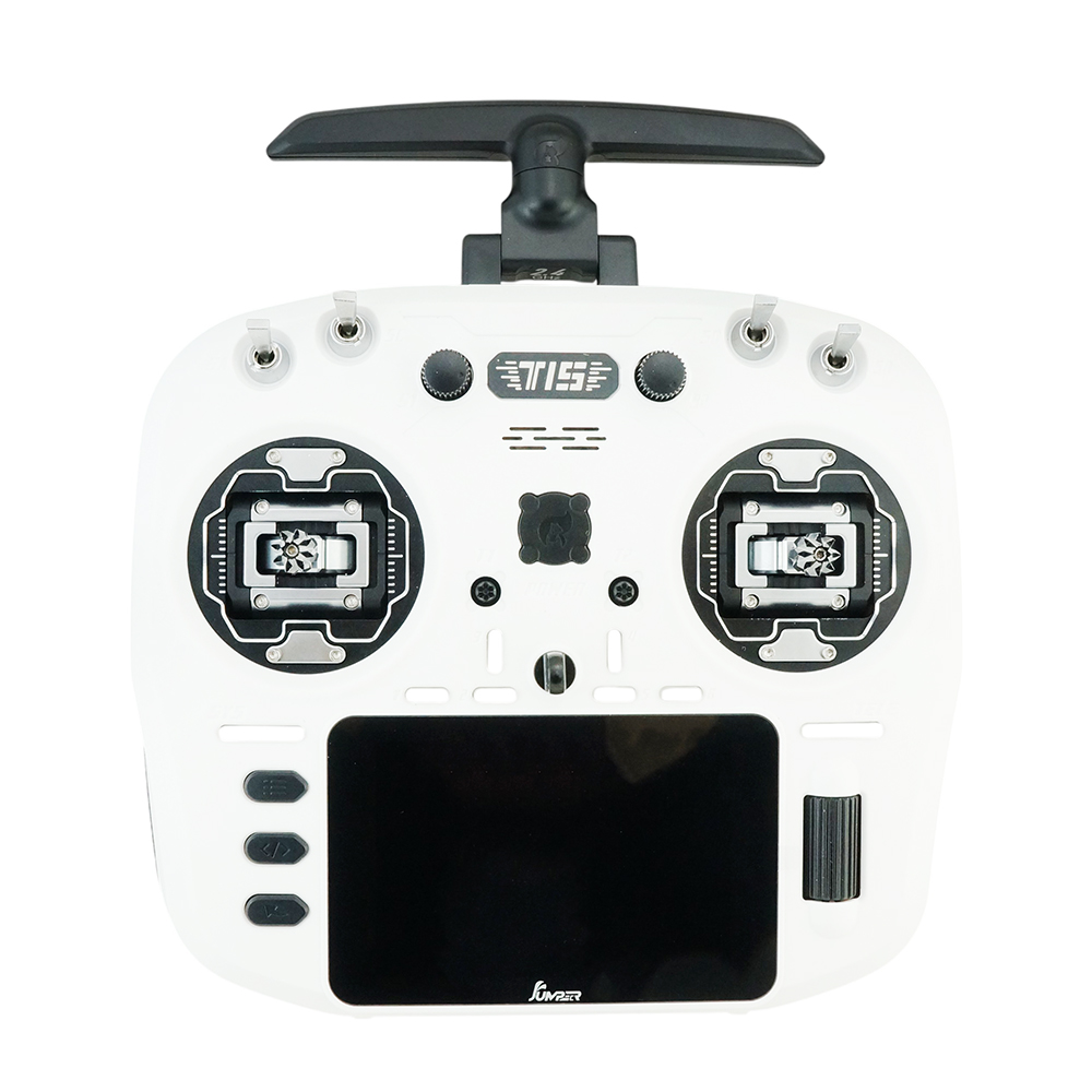 Jumper T15 ist Jumper's Flaggschiff-Modell. Der Transmitter ist im Design dem Jumper T14 sehr ähnlich, bietet jedoch zusätzlich ein großes Farbdisplay und sechs Tasten. Der Jumper T15 verwendet die EdgeTX-Firmware und verfügt über ein 1W ELRS-Modul, das auf 2,4GHz arbeitet. Das Radio misst 185x175x79mm, was mit Radios wie dem TBS Mambo oder dem Radiomaster Boxer vergleichbar ist. Trotz dieser Größe verwendet es große hallmetallische CNC-Gimbals. Der Jumper T15 bietet 4 Schalter, zwei Potentiometer und zwei Tasten, die durch Schalter ersetzt werden können. Darüber hinaus stehen sechs verstellbare Tasten zur Verfügung. Das Radio hat auch Joysticks für Trim-Einstellungen. Ein wesentlicher Vorteil ist der integrierte Speicher, der die traditionelle SD-Karte ersetzt und die Zuverlässigkeit des Radios erheblich erhöht. Für einfacheren Transport verfügt es über eine klappbare drehbare Antenne. Das Radio ist einzigartig mit seinem Farb-IPS-Touchscreen-Display mit einer Auflösung von 480x320 Pixeln und einer Größe von 3,5".