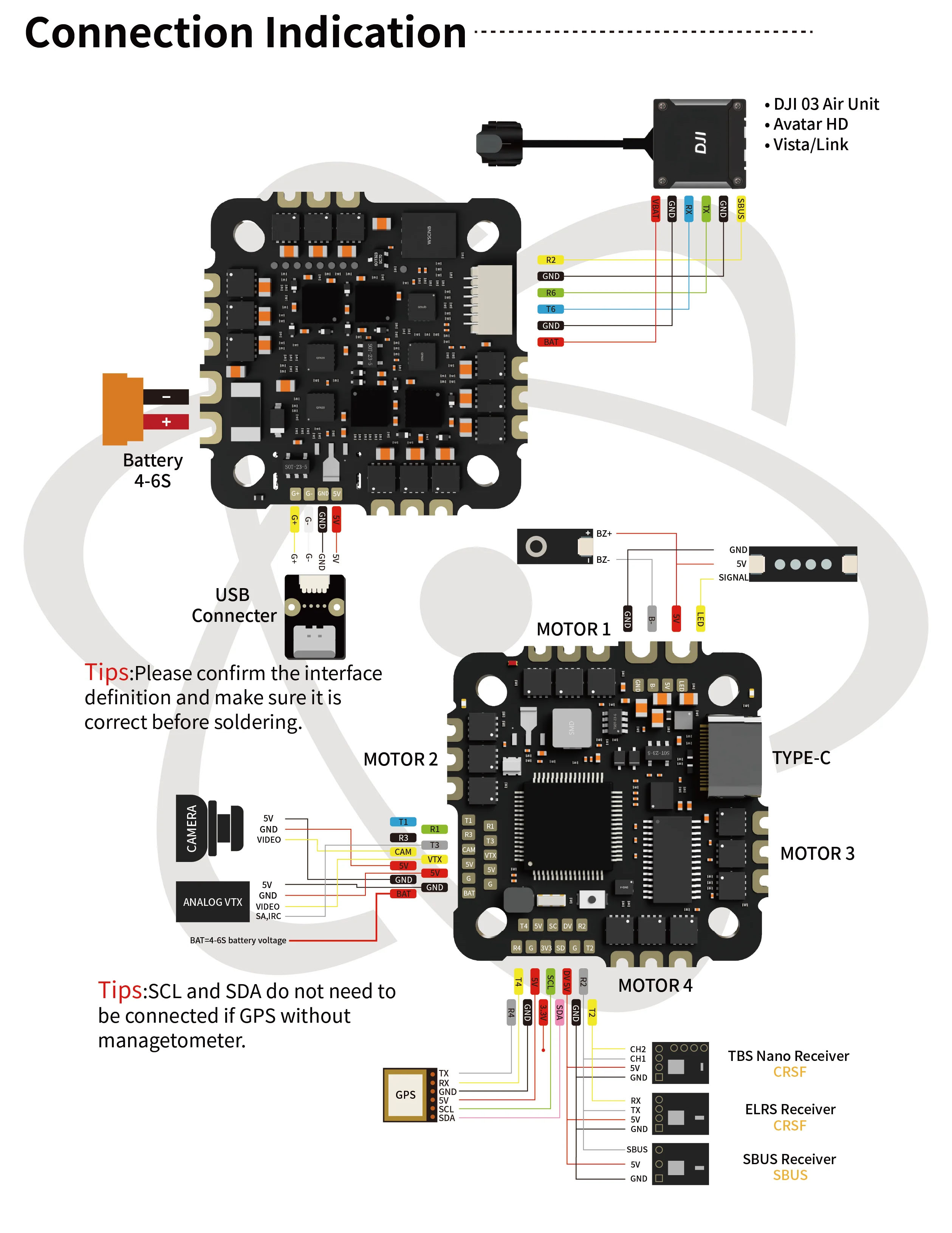Die Platine ist mit einem Anschluss für digitale Video-Transmitter ausgestattet. Es gibt auch Pads zum Anschließen einer analogen Kamera und eines analogen Video-Transmitters.