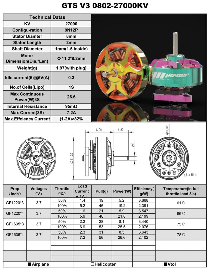RCinpower ist ein führender Hersteller von Motoren für FPV-Drohnen, und der GTS V3 0802 bildet da keine Ausnahme. Unibell Glocke für bessere Haltbarkeit, ein Paar vollständiger lager für längere Lebensdauer. Der 0802 Motor eignet sich für kleine 1S Drohnen und Tinywhoops mit 30-40mm Propellern. Der Motor wird mit Drähten geliefert, die einen Verbinder haben und auf die Leiterplatte an der Unterseite des Motors gelötet sind. Im Falle eines Crashs und möglichen Kabelauszugs wird die Wahrscheinlichkeit einer Beschädigung der Motorwicklungen minimiert. Sie können einfach einen neuen Draht an die Leiterplatte löten und weiter fliegen. Die Welle hat einen Durchmesser von 1mm.