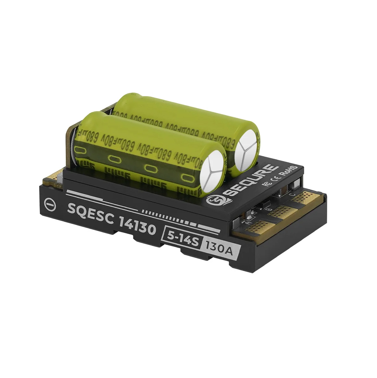 Sequre 14130 ist ein leistungsstarker eigenständiger Regler für größere Flugzeugmodelle oder Langstrecken- und Cinelifter-Drohnen. Der Regler unterstützt die Stromversorgung von 5-14S LiPo-Akkus und einer Stromstärke von bis zu 130A. Der Kern des Reglers ist ein leistungsstarker 32-Bit Mikroprozessor STM32G071, der die Firmware AM32 mit Telemetrieunterstützung verwendet. Für eine gute Wärmeableitung ist der Regler mit Aluminiumkühlkörpern auf beiden Seiten ausgestattet. Elektrolytische Kondensatoren sind bereits installiert, sodass keine externen hinzugefügt werden müssen, was die Installation vereinfacht. Der Regler bietet hervorragende Parameter bei kompakten Abmessungen von 55x30x23mm und einem Gewicht von 62 Gramm. Der Regler ist nicht mit BEC ausgestattet.