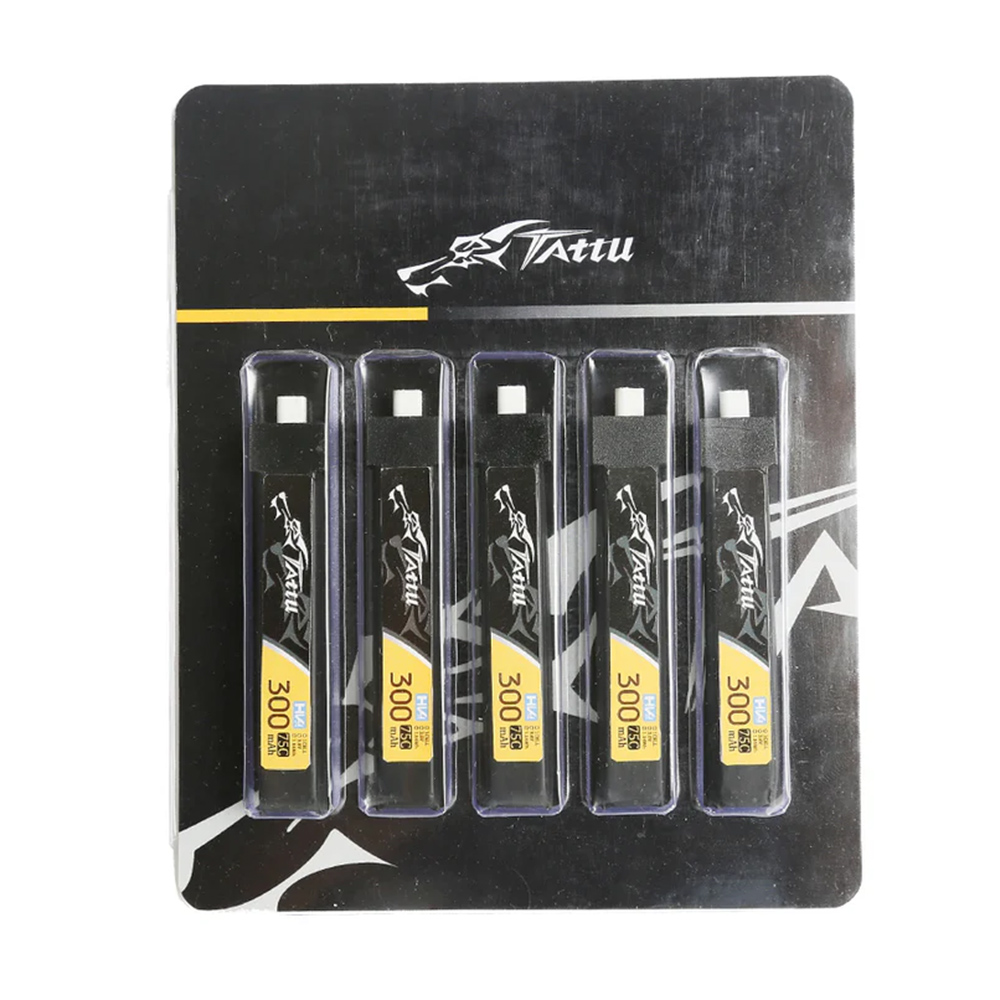 Set von fünf Stück Tattu 300mAh 1S Batterien mit BT2.0 Anschluss. Die Batterien sind hauptsächlich für die kleinsten Tinywhoops mit einer Größe von 65 mm und einem Propeller von 31 mm geeignet.