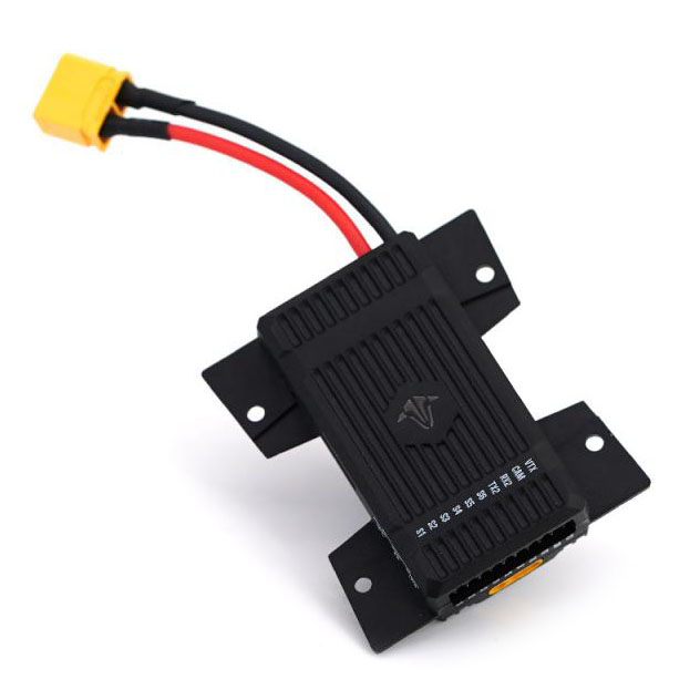 Die Stromversorgung erfolgt über zwei BEC-Schaltkreise – ein Haupt-BEC mit 5V/6V/7,2V und 5A für Servos sowie ein zusätzliches 5V/1A-BEC für GPS und Empfänger. Das Board ist für 2–6S LiPo-Akkus ausgelegt und misst Spannung und Strom. Ein Schalter ermöglicht die Auswahl der Servo-Ausgangsspannung.