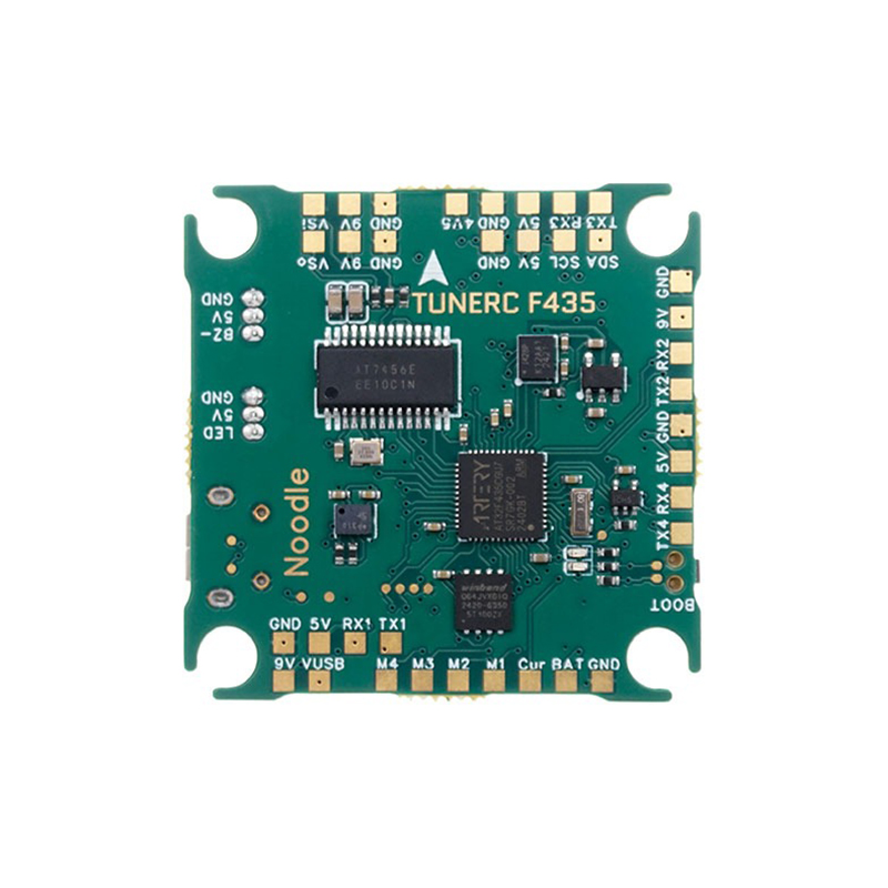 Noodle AT32F435 ist eine preiswerte Flugsteuerung , geeignet für Renn- und Freestyle-Drohnen, die von 3-6S Lipo-Batterien betrieben werden. Das Herzstück der Flugsteuerung ist der AT32F435 Prozessor, kombiniert mit dem ICM42688P Gyroskop. Das Board verfügt auch über 8MB Speicher für die Blackbox, ein Barometer zur Höhenmessung und 5V/1.5A sowie 9V/2A BEC. Für den Anschluss von Peripheriegeräten gibt es 4 UART-Ports und einen I2C-Bus.