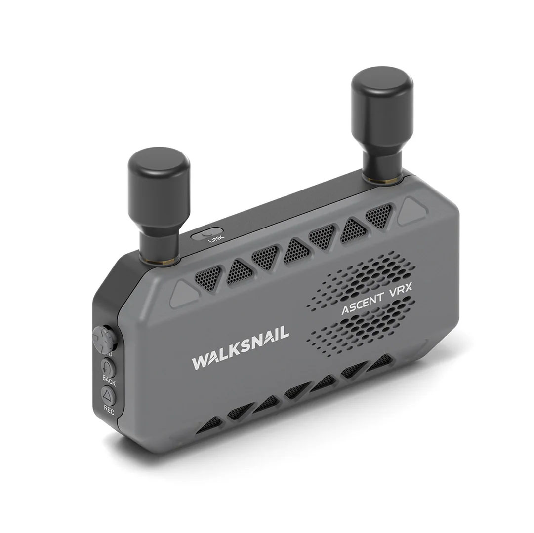Walksnail Ascent FPV VRX ist ein digitaler Empfänger mit HDMI-Ausgang, der eine Verbindung zu FPV-Brillen oder einem Monitor ermöglicht. Der Empfänger ist mit zwei LHCP polarisierten Antennen ausgestattet. Er hat einen microSD-Kartensteckplatz und ermöglicht die Aufzeichnung empfangener Bilder. Die Stromversorgung erfolgt über einen standardmäßigen koaxialen DC-Anschluss im Bereich von 7.4–25.2V, was ihn ermöglicht, mit einem 2–6S-Akku betrieben zu werden.