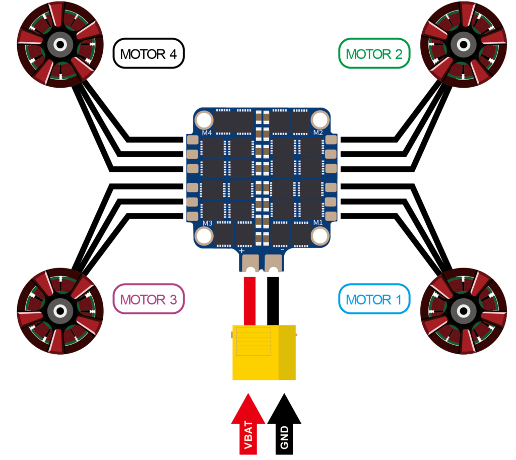 Am verbreitetsten sind 4-in-1-ESCs — vier Regler auf einem Board. Standard-Montageraster: 30,5×30,5 mm (für 5–10″) und 20×20 mm (für 2–5″). Sie werden im Stack mit der FC verbaut und über Kabelbaum oder Board-Connector verbunden. Das spart Platz, Gewicht und vereinfacht die Verdrahtung. Die angegebene Stromstärke gilt pro Kanal.